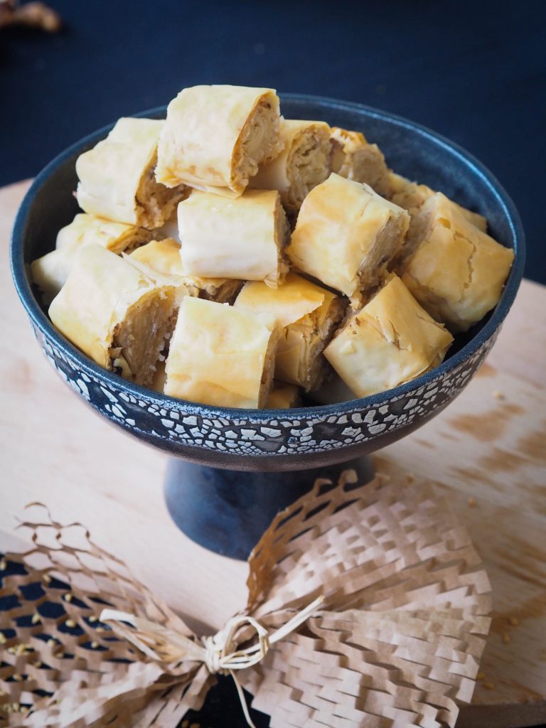 Baklava yufkalarını üst üste dizerek ilerleyeceğiz. Baklava yufkasının 1. ve 2. katına eritilmiş tereyağı sürülür. 3. Katına tereyağı yerine tahinimiz aynı şekilde sürülür ve tahinin üzerine toz şeker ve ince çekilmiş ceviz eklenir. Daha sonra rulo şeklinde özenle sarılır. Rulo şeklinde sarılan baklava yufkamızı eşit parçalarda dilimleyip bölelim. Yağlı kağıt serili fırın tepsisine alarak önceden ısıtılmış 180 derece fırında üzeri kızarana kadar(yaklaşık 15 dk.) pişirelim.